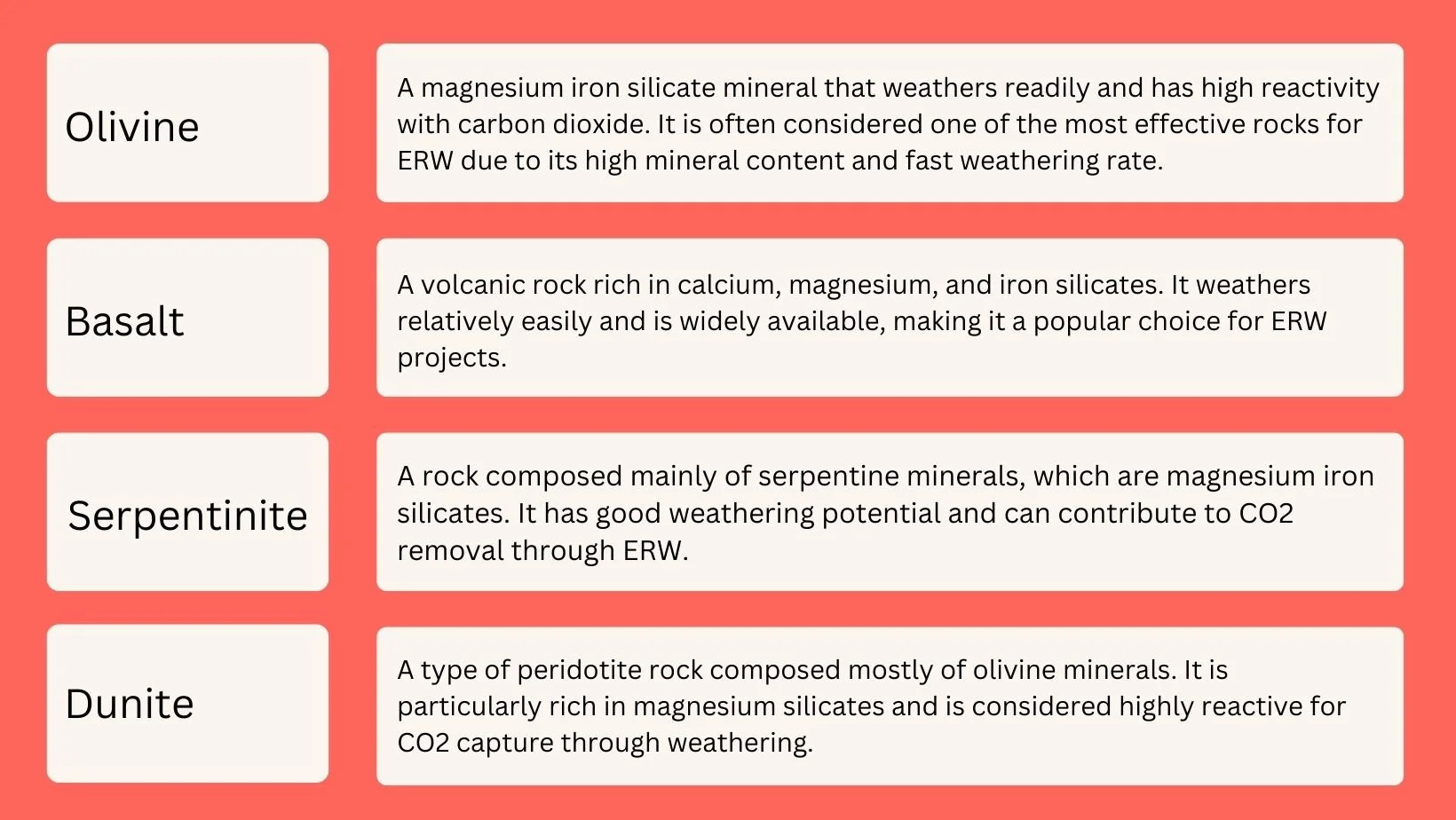 A variety of rocks can be used for ERW, but the most commonly considered rocks are silicate minerals. Silicate rocks contain minerals rich in silicate compounds, such as calcium, magnesium, and iron silicates. Some examples of rocks commonly used for ERW include the below: