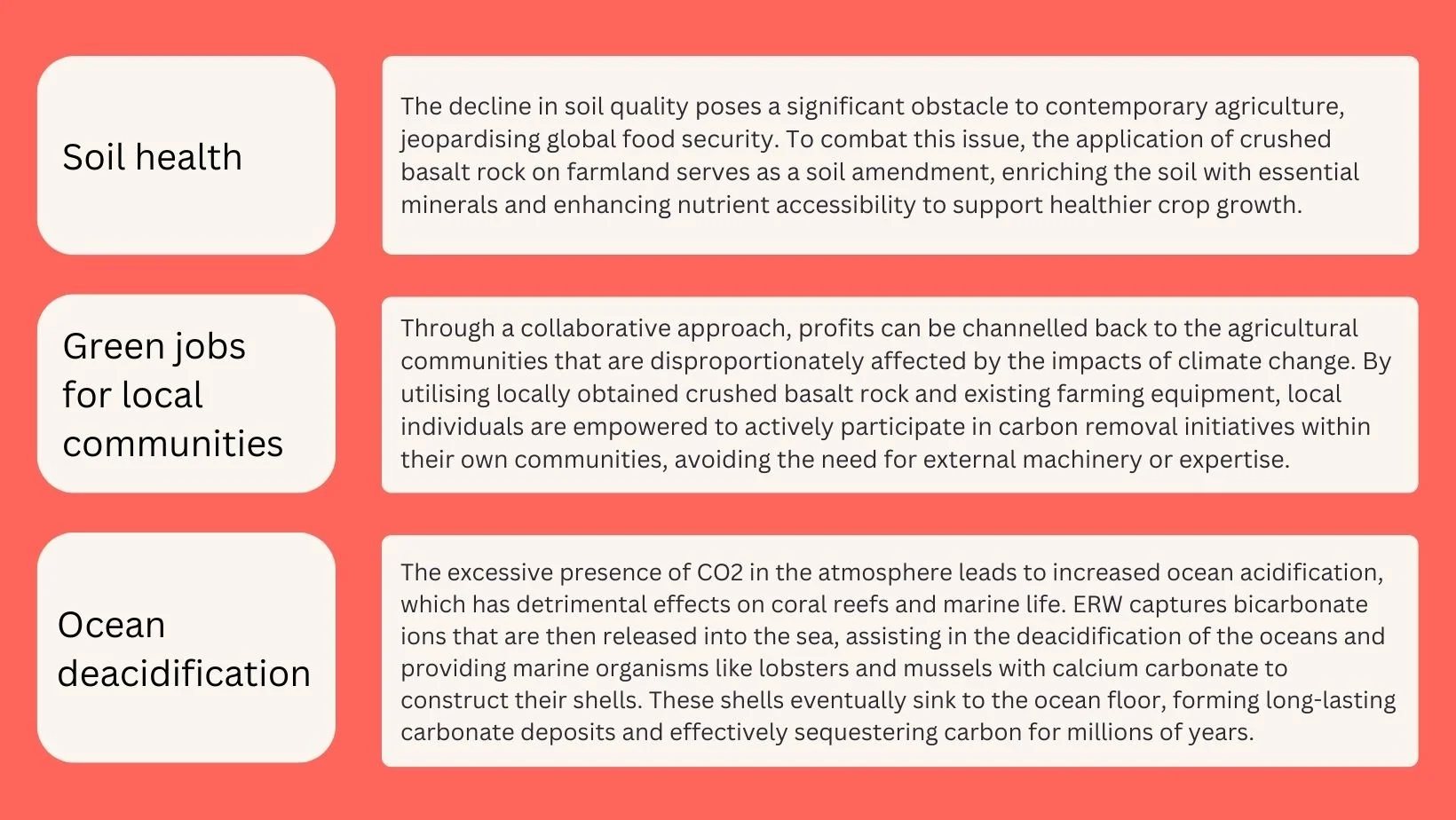 ERW carbon credits are particularly attractive due to their additional co-benefits as they create more value, making them an attractive option for buyers. Alongside CO2 removal, the dissolution of minerals in ERW can improve soil fertility, enhance agricultural productivity, and potentially reduce the need for synthetic fertilisers. See table below for the three main co-benefits derived from ERW:
